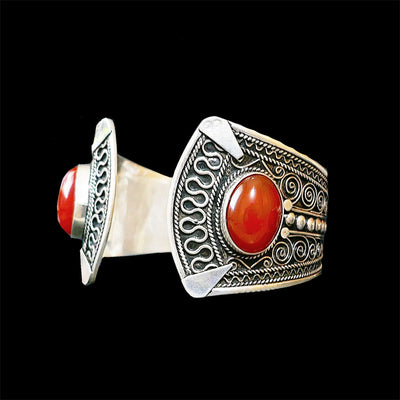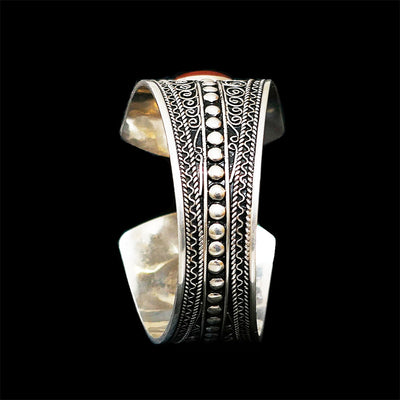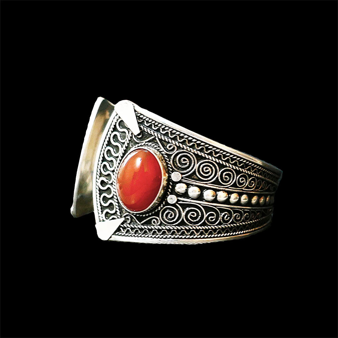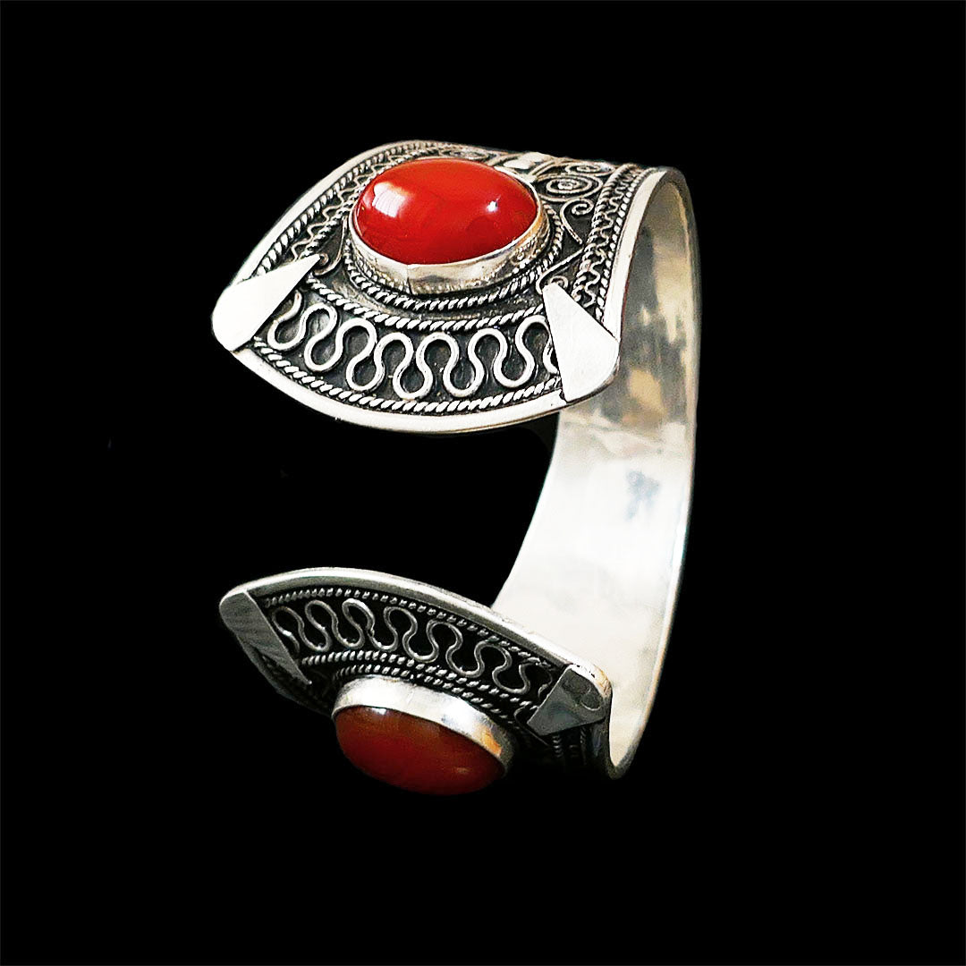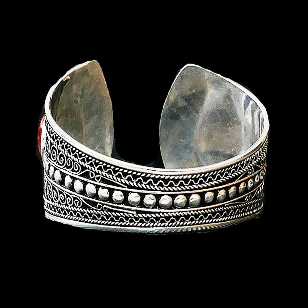 This chunky and cool Boho bangle is originally from Agadir, Morocco. It is made in solid sterling silver with engraved patterns made of finely twirled silver yarns on surface with two beautiful authentic Coral gemstones. The geometric and graphic cut brings a cool edge to the BOHO Bangle.