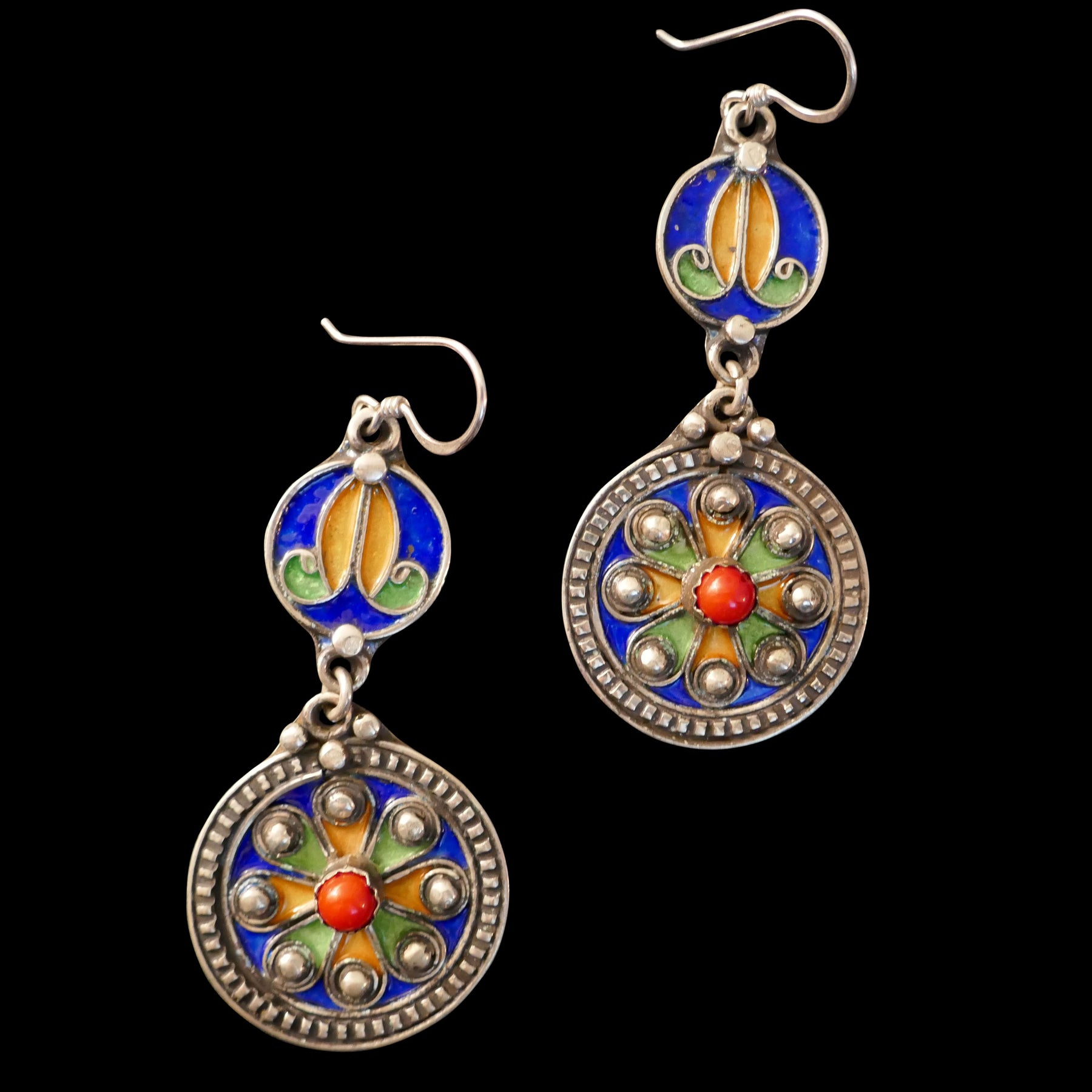 These vintage ethnic earrings features fantastic filigree-style wirework with unique-colored enamel in royal blue, orange and green.