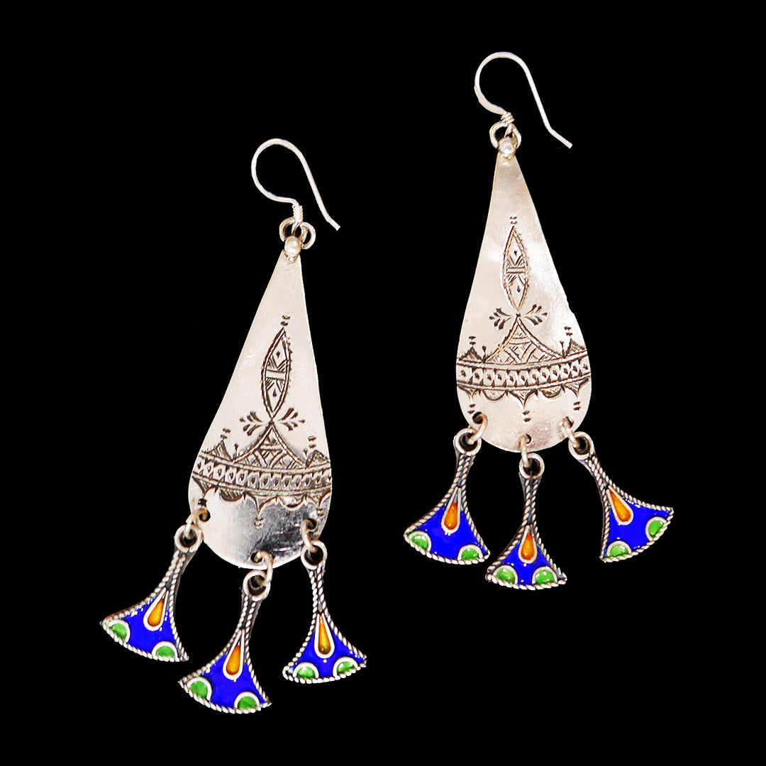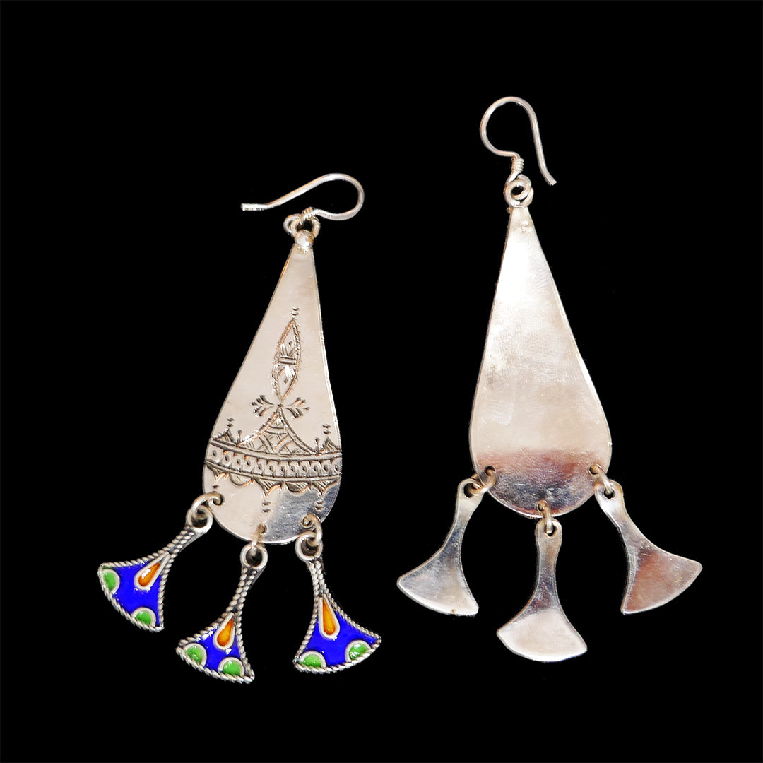 These vintage ethnic earrings features fantastic filigree-style wirework with unique-colored enamel in royal blue, orange and green. The engraved symbols are from the indigenous tribe of Tuareg, Southern Morocco. It is made in solid sterling silver with engraved patterns on surface. The geometric and graphic cut brings a cool edge to the BOHO earrings.
