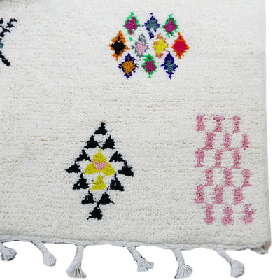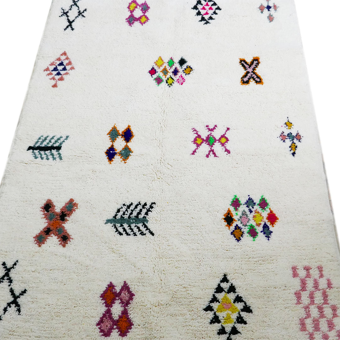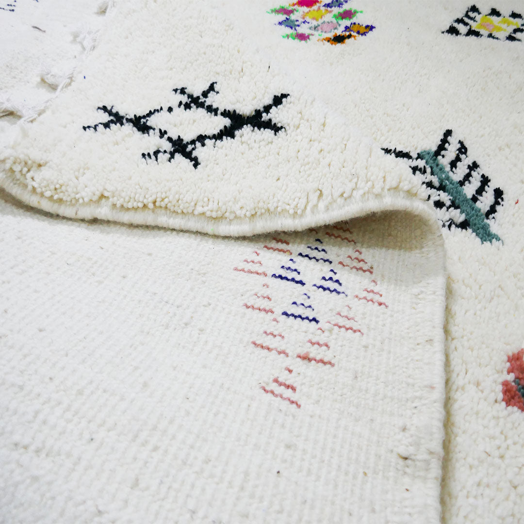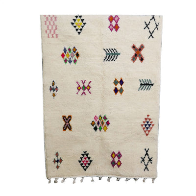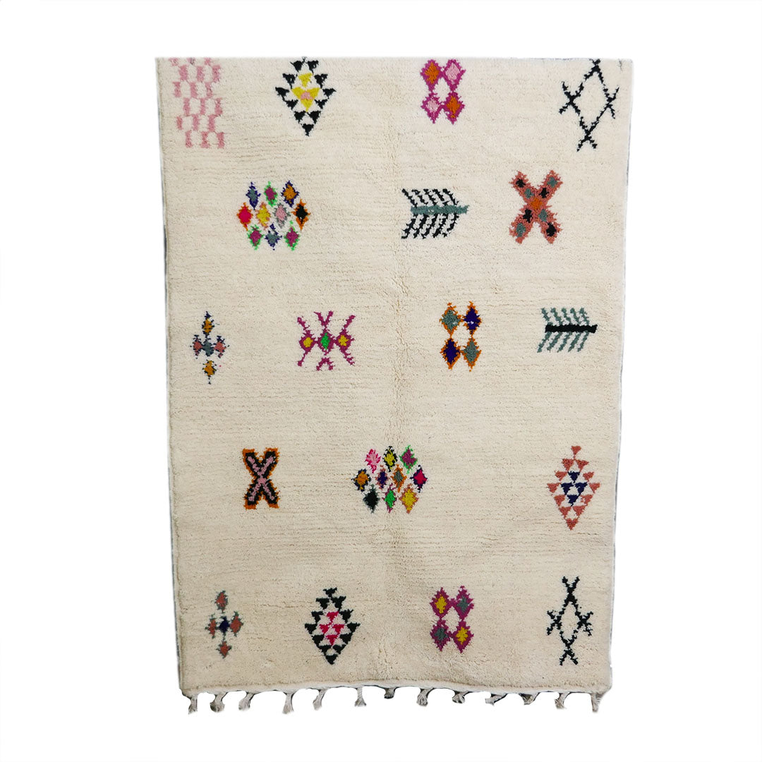 Hecho a mano con lana orgánica natural, Las alfombras Beni Mrirt son conocidas por sus patrones geométricos suaves y su estilo minimalista. Vienen en muchos colores y completan toda la decoración del hogar, desde bohemio hasta moderno, añadiendo un toque marroquí adicional.