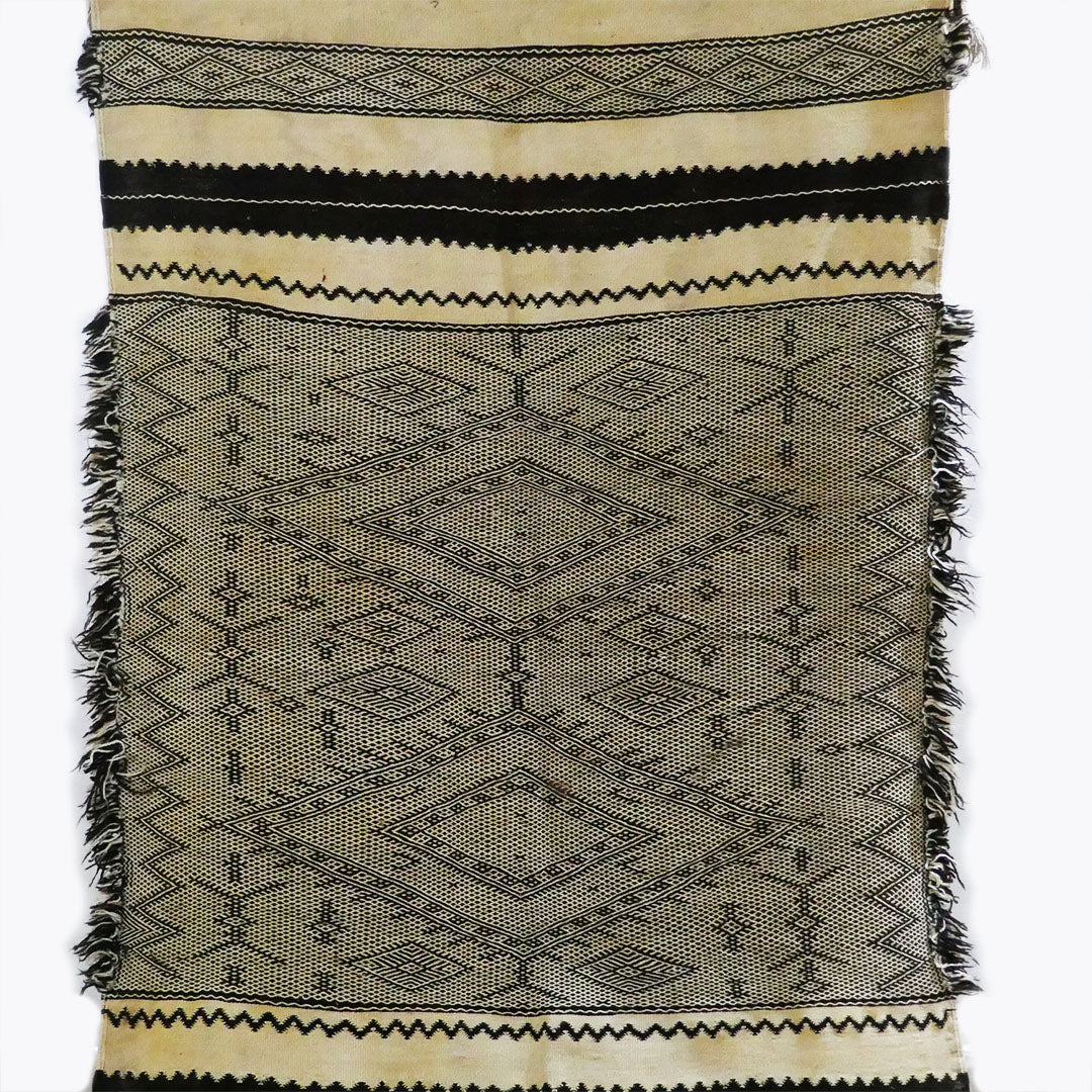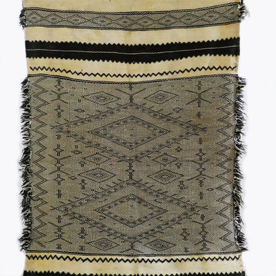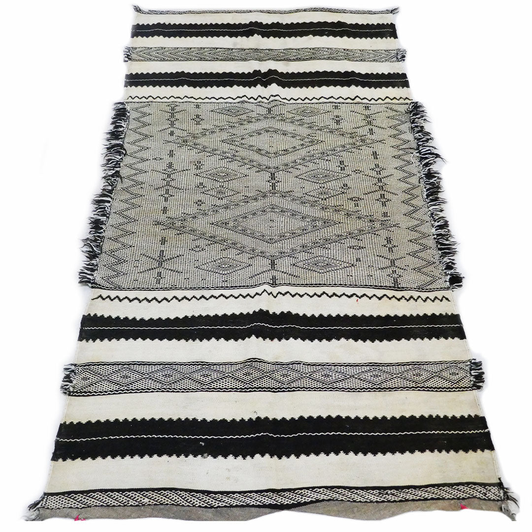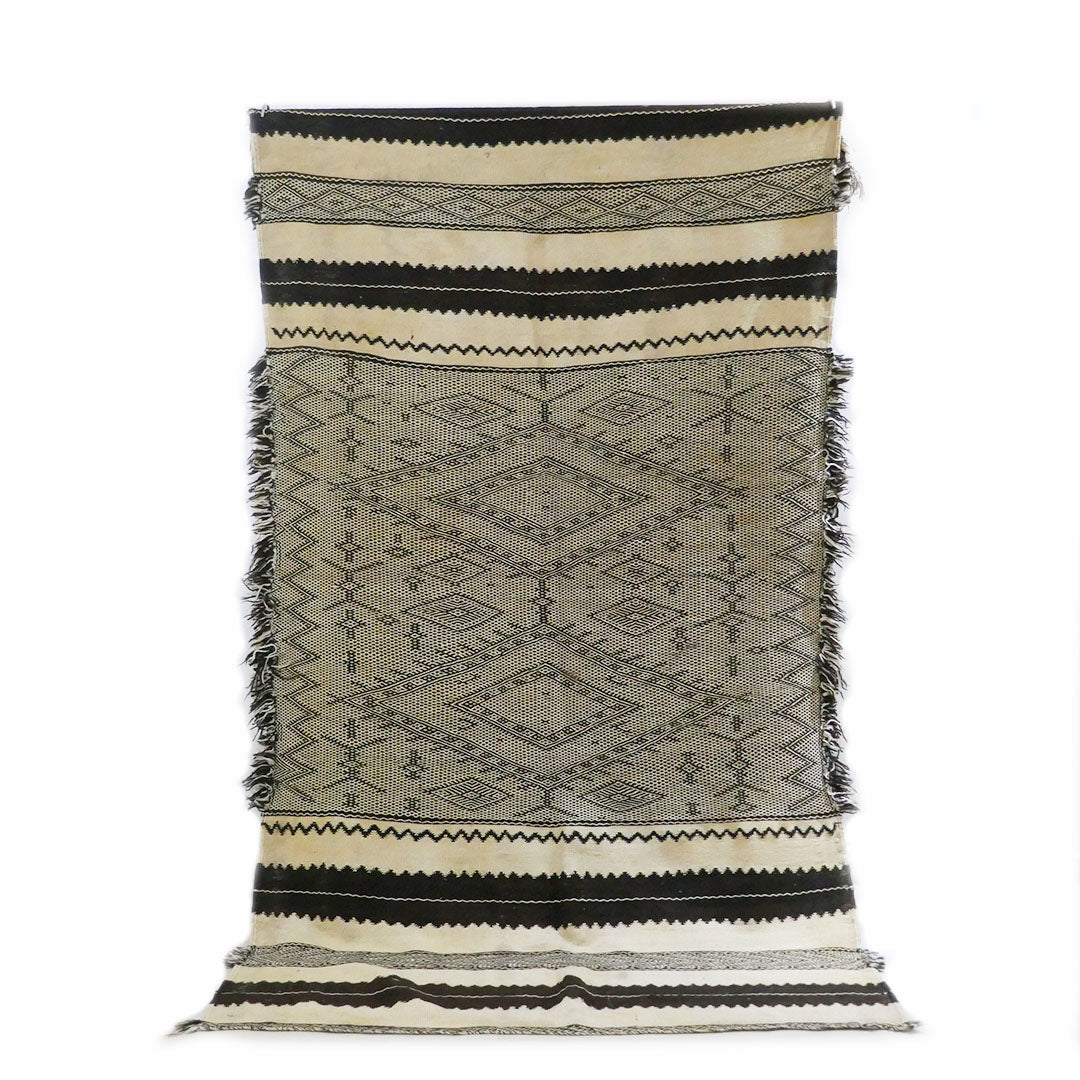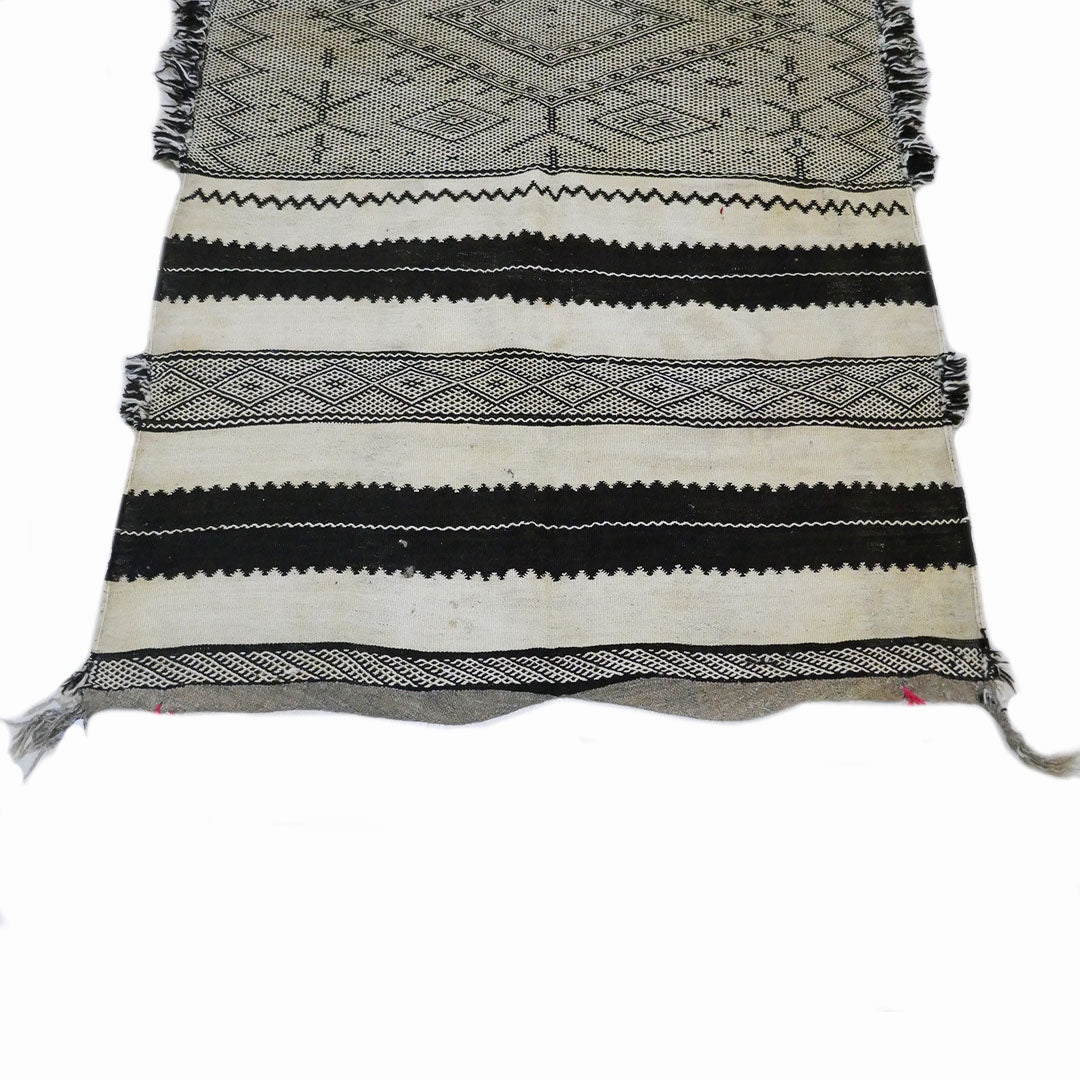 This rug has the distinguished black and white pattern common to Zanafi rugs.