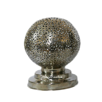 This handcrafted silver brass ball-shaped lamp features beautiful filigree design work that can complement any interior design. The Moroccan table lamp can be used as a bedside table lamp, living room décor, or provide a Moroccan touch to commercial projects.